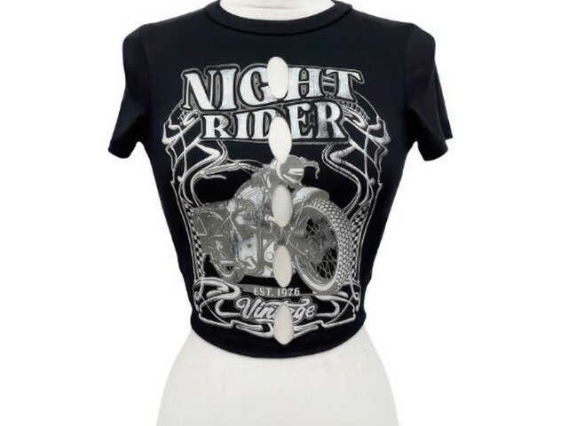 The Night Rider Vintage Cut-Out Crop Tee delivers bold attitude with a modern, sculpted edge. Designed with a flattering slim silhouette, this cropped style enhances your shape while offering comfortable stretch for all-day wear. The front cut-out detail adds a striking focal point, perfectly complementing the screen-printed graphic for standout appeal. Crafted from a soft cotton blend, it feels smooth against the skin with just the right amount of flexibility. The classic round neckline and short sleeves balance its edgy design, making it an effortless statement piece. Pair it with high-rise denim or cargo pants for a confident, street-inspired look. 95% Cotton, 5% Spandex